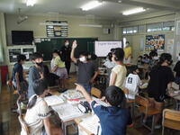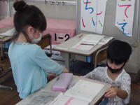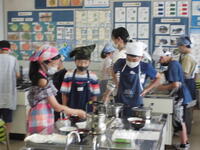 授業の様子です。水の量を表す学習、長さを調べる学習、夏の星についての学習、図工の制作活動、英語学習での話し合い・発表、ヘチマの観察、タブレットを活用した学習、調べたことの発表、家庭科の実習、体育の学習など、子どもたちは今日も意欲をもって学んでいました。