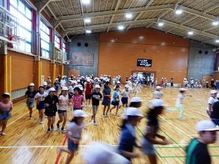 雨で校庭が使えないため、体育館で朝マラソンに取り組む子どもたちです。