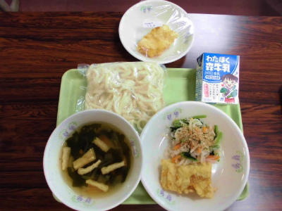 おかめうどん、牛乳、いかの天ぷら、切り干し大根の和え物