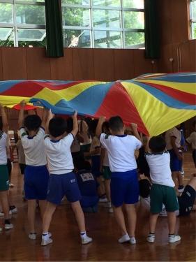 合同学習会のメインイベント、バルーンで楽しくの様子です。2つのバルーンを大勢の友達と力を合わせて動かします。