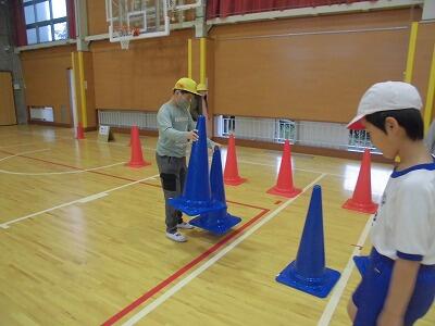 最後にサーキット走です。①ハードルジャンプ、②ケンケンパ、③平均台渡り、④トンネルくぐり、⑤ジグザグ走のコースをやさしいコースと難しいコースの2種類用意し、自分の体力にあったコースを選択し取り組むことができました。子ども達はとても意欲的に一生懸命取り組んでおりすばらしかったです。
