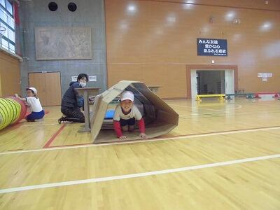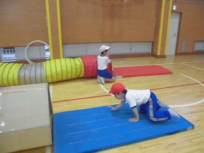 続いて今日の初めて行う課題のトンネルくぐりです。「とよはるトンネル」と子ども達が命名し手足をうまく使ってスピードでくぐり抜けます。