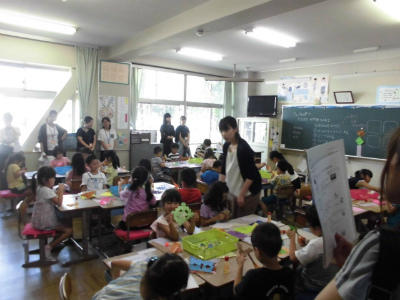 1年2組も図工「ちょっきんぱかざり」です。保護者が子どもの側にいついてアドバイスをしてくれていました。みんなきれいな作品を作れましたね。