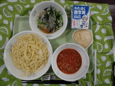 今日の給食は、スパゲッティ、牛乳、ミートソース、キャベツとじゃこのサラダ、きなこチーズ蒸しパンでした。ミートソースはとってもおいしく、蒸しパンも子ども達はうれしそうにおいしく食べていました。