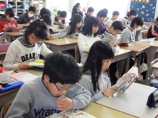 読書タイム・読み聞かせ 投稿日時 : 2017/02/27 豊春小 カテゴリ: 黙々と読む5年生です。1年生と2年生は図書委員会の皆さんによる読み聞かせです。終わると拍手を送っています。図書委員会の皆さん、ありがとうございます。