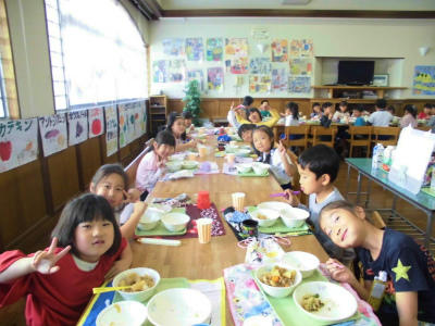 1年交流給食 投稿日時 : 2018/11/02 豊春小 カテゴリ: 本日は、1年生で運動会で紅組の児童がランチルームに集まり、一緒に給食をとりました。ジュース付きです。みんな笑顔で楽しく過ごすことができました。