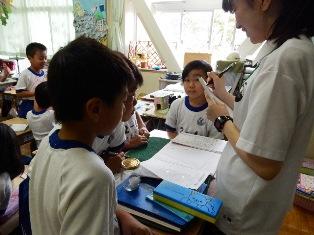 2年生の教室では、担任の先生と実習生のところで九九の5の段を