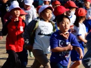 暖かな日射しを受けながら朝マラソンに取り組む子どもたちです。