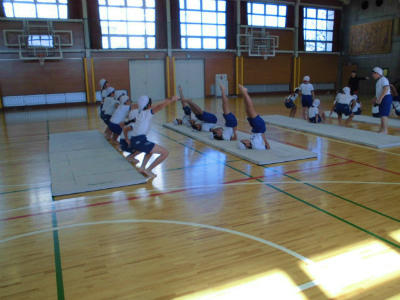 4年体育:マット運動 足の先までしっかりと伸びていますね。