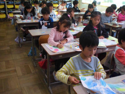 2年図工:「ぎゅっとしたいわたしの友だち」で、楽しそうに作品作りをしていました。