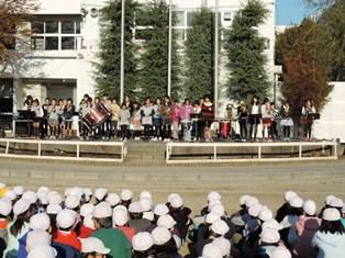 児童朝会 投稿日時 : 2015/12/09 豊春小 カテゴリ: 今日の児童朝会は、金管バンドクラブ、バトンクラブの皆さんの演奏・演技でした。はじめに金管バンドクラブの演奏、次にバトンクラブの演技、最後は合同での演奏演技を全校児童の前で披露しました。発表が終わるたびに大きな拍手が送られました。