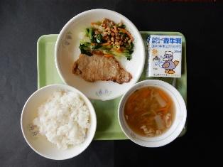 ごはん、豚肉のオイスターソース焼き、くるみ和え、みぞれ汁、