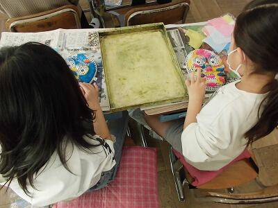 【2年生 図工】お面に飾り付けをして完成させました。