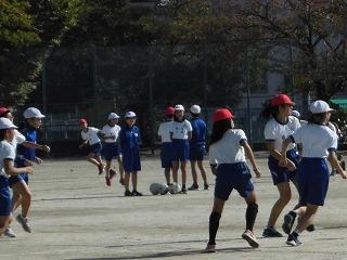 6年生 体育 サッカーゲーム 秋空の下、気持ちよく体を動かしています。