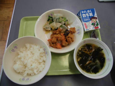 ごはん 牛乳 酢豚 大根の中華あえ わかめスープ