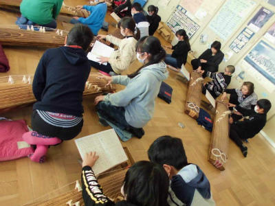 本日は、生田流の宮西先生に箏の演奏について教えていただき、「さくらさくら」の曲に挑戦しました。豊春中学校でも箏曲部の御指導にあたっていらっしゃる宮西先生にお越しいただいたり、箏を豊春中学校からお借りできたりしたので、日本の音楽に親しむことができました。