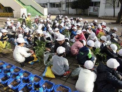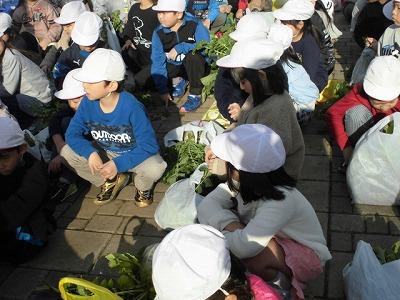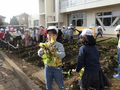 大根やかぶ、赤かぶなどとっても大きく育った野菜を大喜びで収穫していました。自分の顔より大きくなった大根などを見て、「すごーい!」と大きな歓声があがっていました。これまで何度も学校に足を運び、野菜の成長を確認し、育てるコツを教えていただいた地域の学校応援団の方々にお礼を言って終わりにしました。