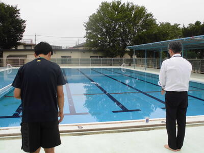 約束やきまりをしっかり守って楽しくて安全な水泳学習になるように校長先生や体育主任の先生からのお話を聞きました。運動委員会の児童のみなさんにもお手本を見せてもらい、学習の準備はばっちりです。