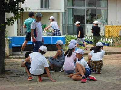 栽培委員会の子どもたちは、プランターの花を植え替えています。
