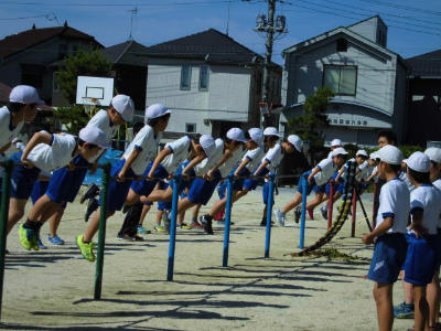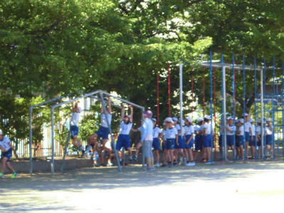5年生 遊具も利用しながら、校庭いっぱいサーキットトレーニングのように走り回ります。