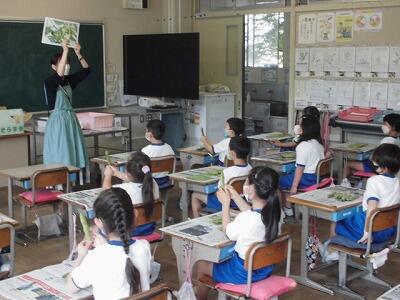 【2年生】川鍋栄養士から、空豆の育ち方のお話を聞き、さやむきを行いました。