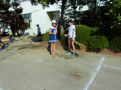 6年生の朝掃除です。竹箒を上手に使っていました。