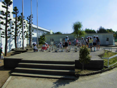 5年生のバケツ稲で、自分たちで植えた稲の様子を観察しています。