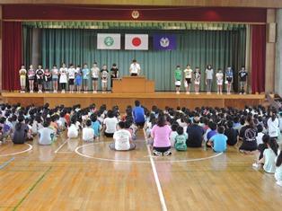 表彰朝会 投稿日時 : 2015/07/08 豊春小 カテゴリ: 今日は表彰朝会を行いました。第61回市民体育祭、市内陸上競技大会、硬筆展県中央展・市内展・校内展のそれぞれの表彰を行いました。全校で表彰された皆さんを拍手で称えました。