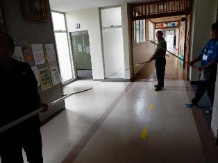 不審者対応避難訓練 投稿日時 : 2015/10/16 豊春小 カテゴリ: 今日は、不審者が校舎内に侵入したという設定で、不審者対応避難訓練を実施しました。緊急放送の後、職員がさすまたなどを手にして、指示された場所に集合しました。教室内では、廊下側の出入り口を机やイスでバリケードを築いていました。