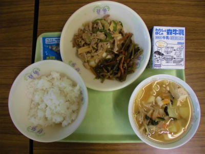 ごはん 牛乳 豚肉と野菜の生姜焼き くきわかめの炒めもの みそ汁 小魚