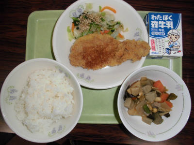 本時の給食は、ごはん、牛乳、わらじかつ、キャベツのごま和え、五目煮です。