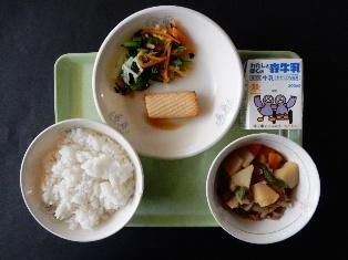 ごはん、いかの照り焼き、白菜のおひたし、肉じゃが、牛乳です。