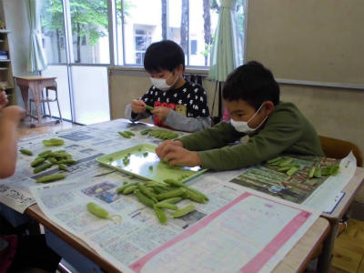 1年生グリーンピースさやむき体験 投稿日時 : 2017/05/15 豊春小 カテゴリ: 学校栄養士からグリーンピースについて話を聞きました。むき方、しっかりと覚えたかな?お家でもやっているよという声も聞こえてきました。みんな一生懸命むいていました。本日の給食にグリーンピースとわかめご飯が出ます。楽しみですね。