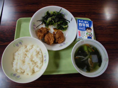 献立 ごはん、牛乳、とり肉のから揚げ、磯香和え、みぞれ汁