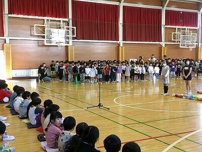 全校児童が体育館に集まり、1年生を迎える会を行いました。