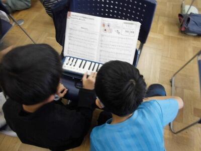 【4年生 音楽】お友達と見合いながら、「茶色の小びん」の合奏練習をしました。