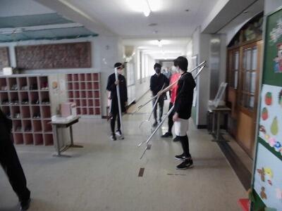 【不審者侵入想定避難訓練】各クラスでバリケードを作りました。さすまたの使い方の確認も行いました。