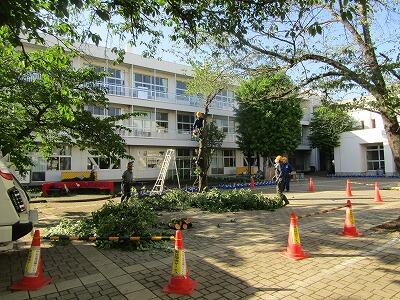 昇降口付近の一本の桜の木が寿命を迎えました。木の根元が腐り、いつ倒れてもおかしくない状態になってしまいました。そこで、本日伐採をしました。とても悲しいことですが、こどもたちの安全確保のため、苦渋の選択です。毎年桜の花で楽しませてくれた木に感謝の気持ちで見送って欲しいと思います。