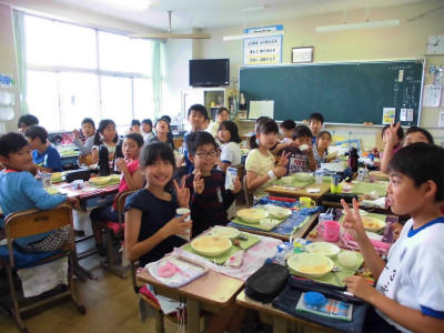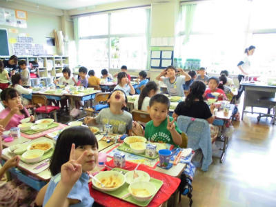 みんな毎日楽しみにしている給食です。みんな満足そうな顔をしています。