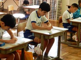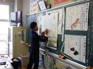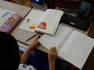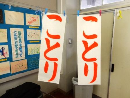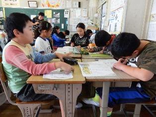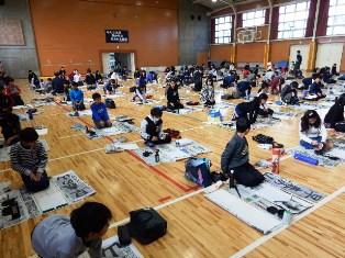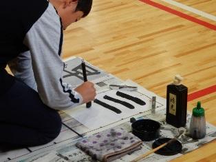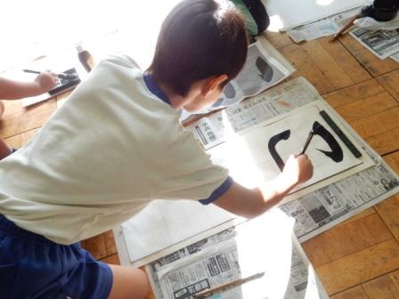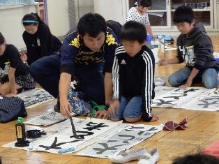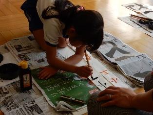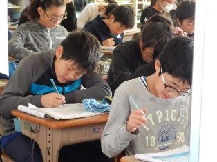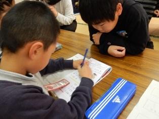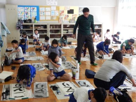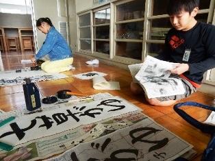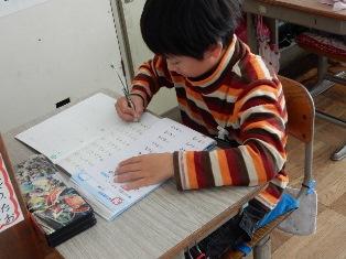 8組では、3年生と4年生が書き初めの練習をしていました。