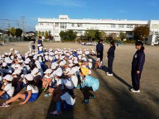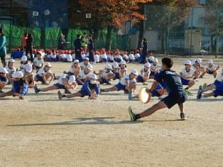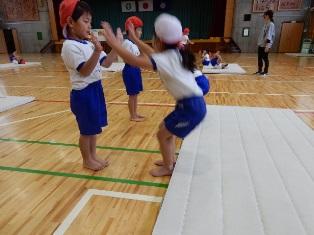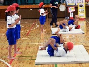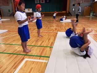 1年生はマット運動です。背中を丸めてマット上で転がり立っていつ