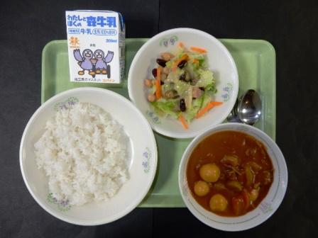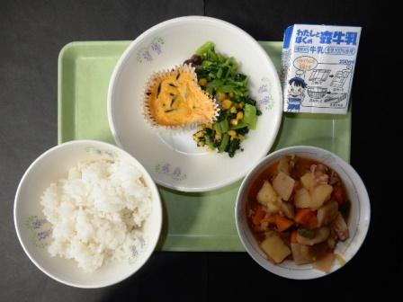 ごはん、たまごやき、青菜の炒め物、肉じゃが、牛乳です。