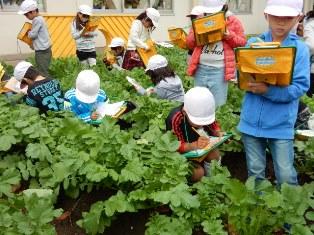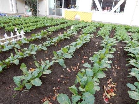 2年生が種まきした学校ファームの様子です。大根や蕪が本当に大きくなってきました。