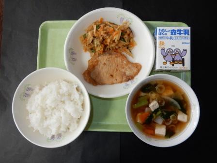 ごはん、ぶた肉のごまだれ焼き、切り干し大根の煮物、けんちん汁、牛乳です。