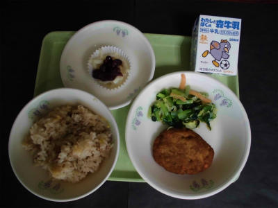 ひじきご飯、ミルフィーユカツ、きのこサラダ、牛乳です。