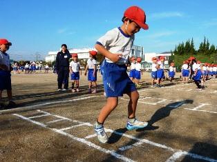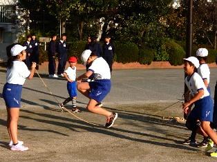 朝マラソン前に縄跳びの練習する3年生です。二重跳びが