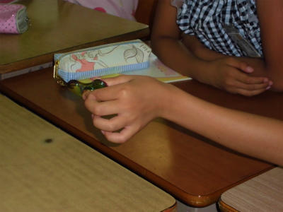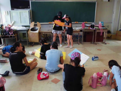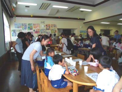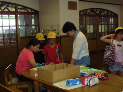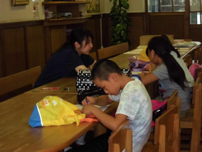 参加する子どもを確認しています。涼しいランチルームが学習の場所です。