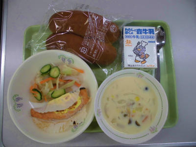 ごはん、牛乳、油林鶏、春雨サラダ、野菜スープ