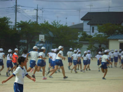 ラジオ体操、3分間マラソンの後もダッシュで汗を流す高学年児童。