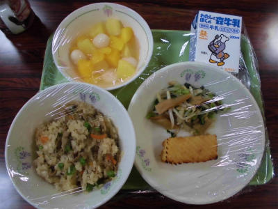 ぶた肉とごぼうのごはん、牛乳、いかのねぎみそ焼き、青菜とメンマのソテー